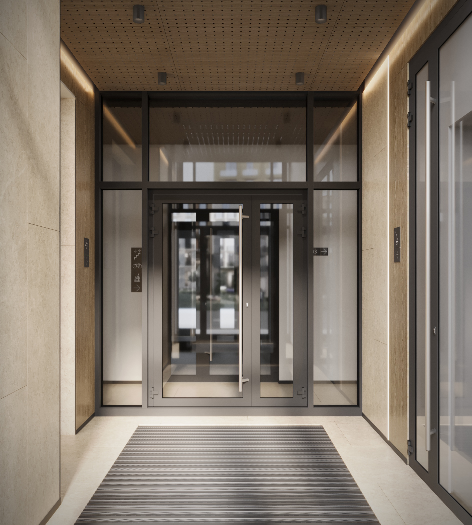 Для удобства родителей с колясками, велосипедистов и маломобильного населения – безбарьерная среда. Вход в подъезд без ступеней на уровне земли гораздо удобнее пандусов