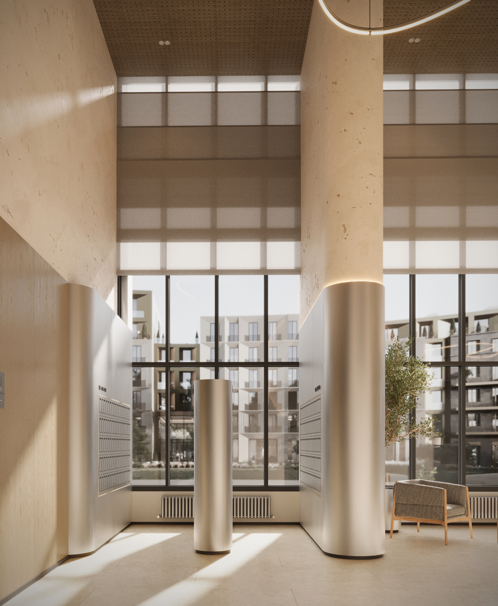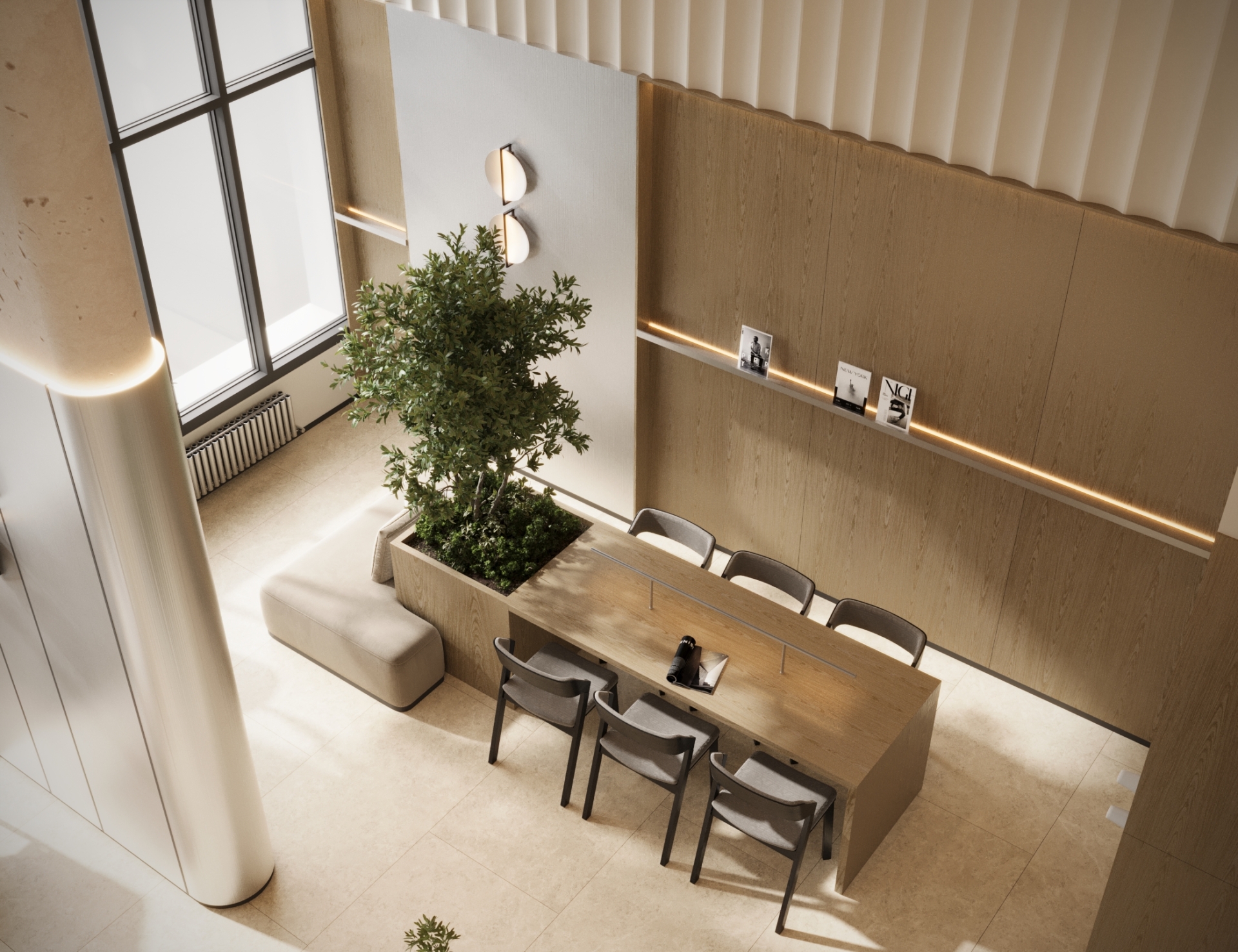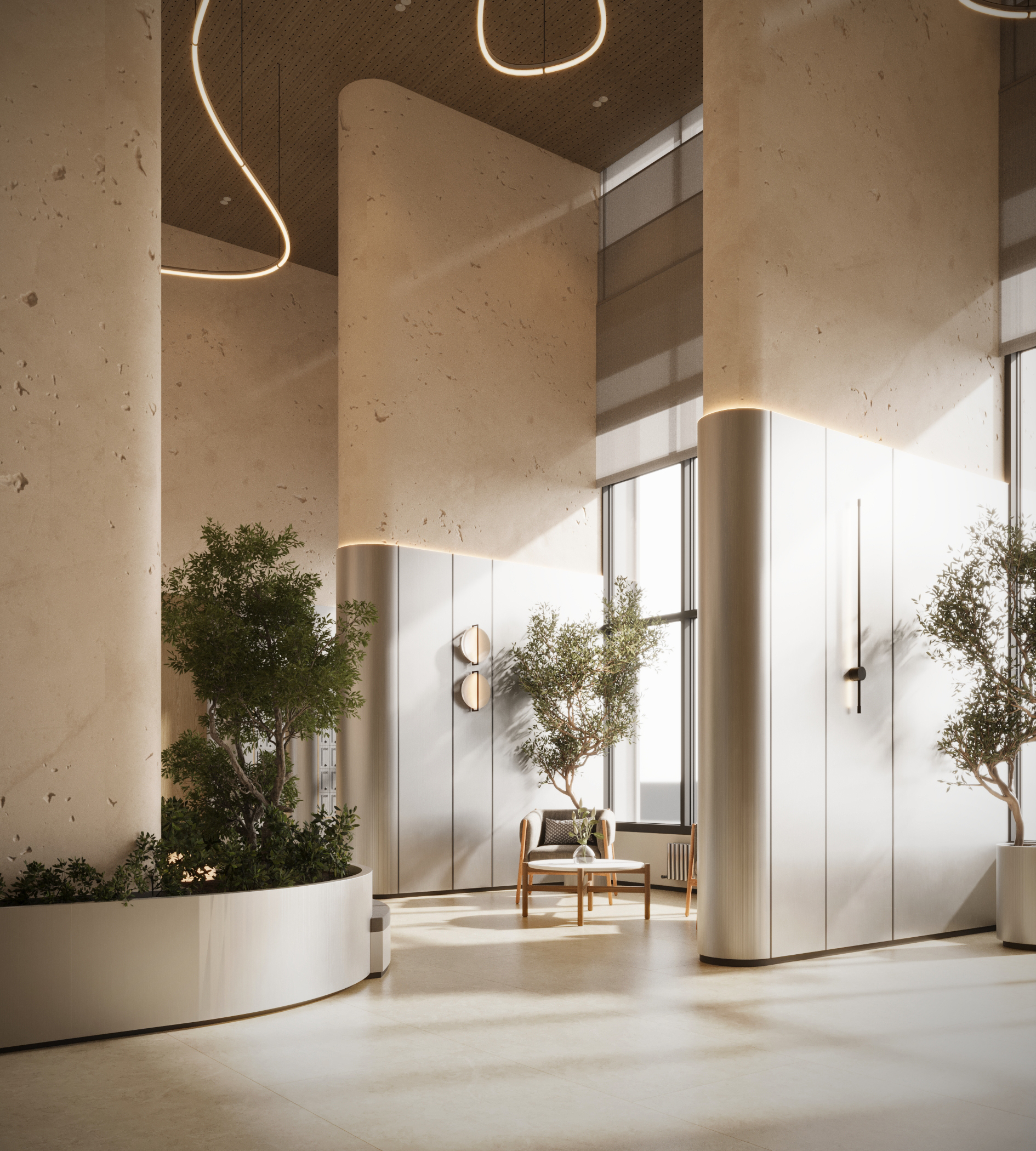 Стильное лобби на первом этаже. Вертикальное озеленение, природные оттенки, обилие солнечного света создают умиротворяющую обстановку