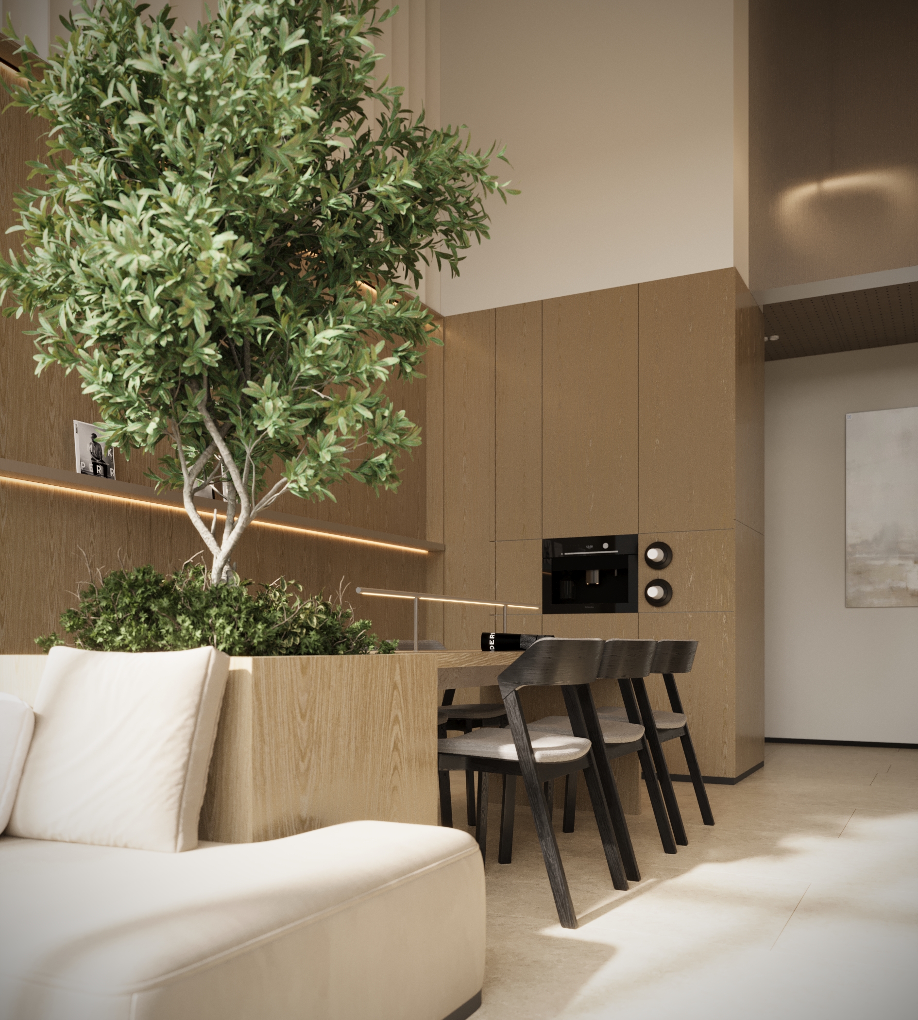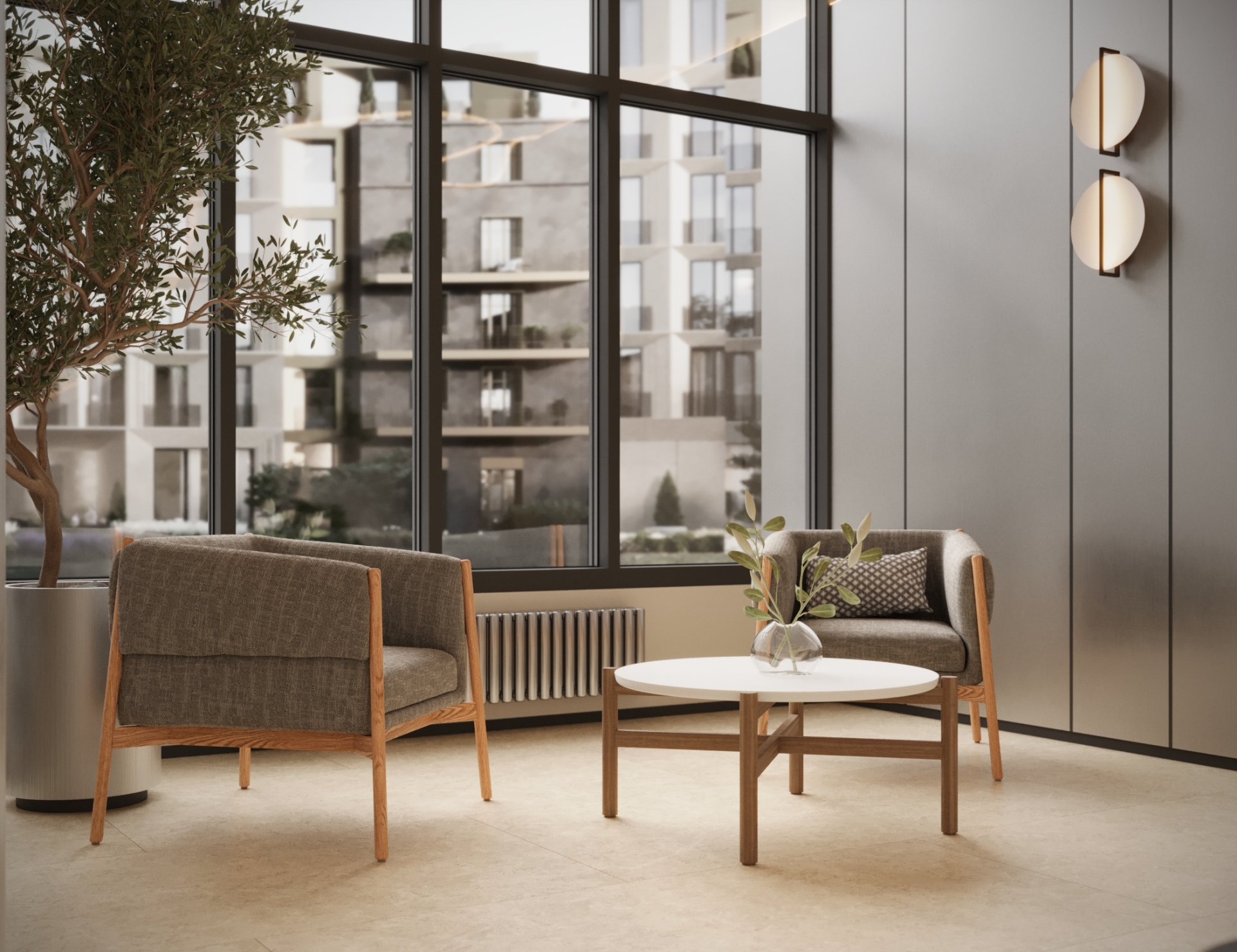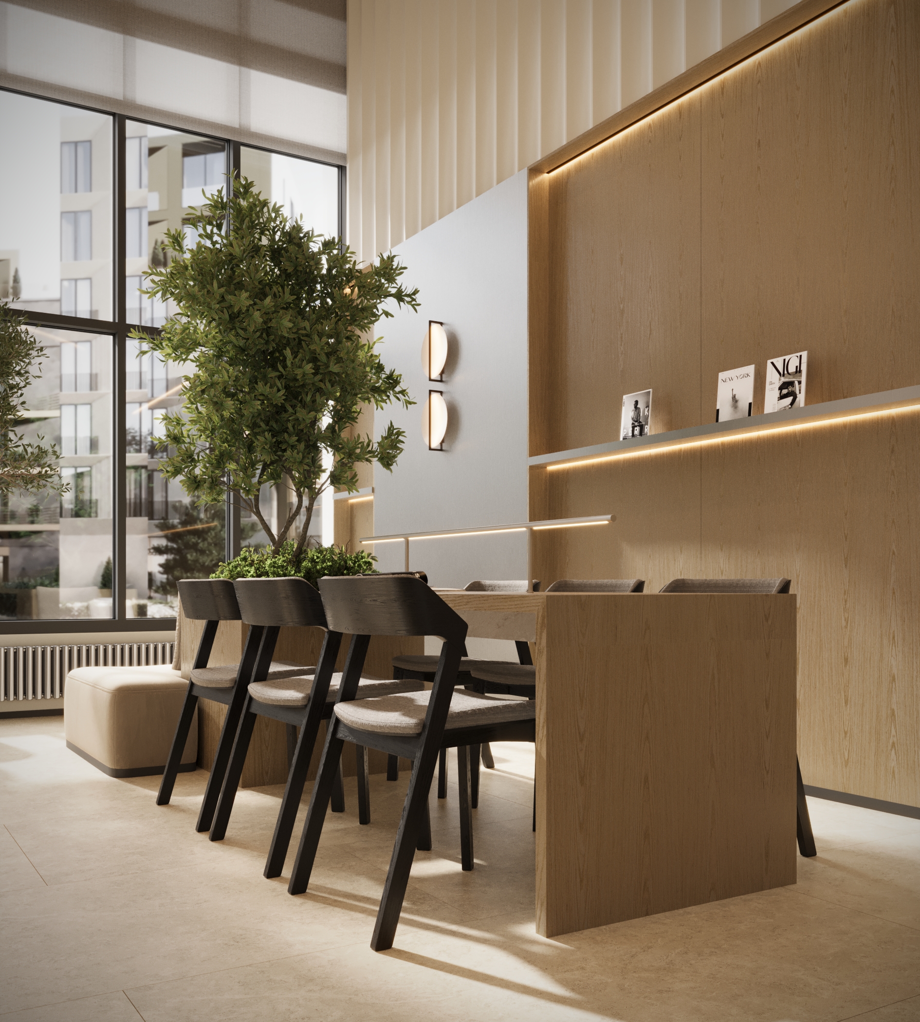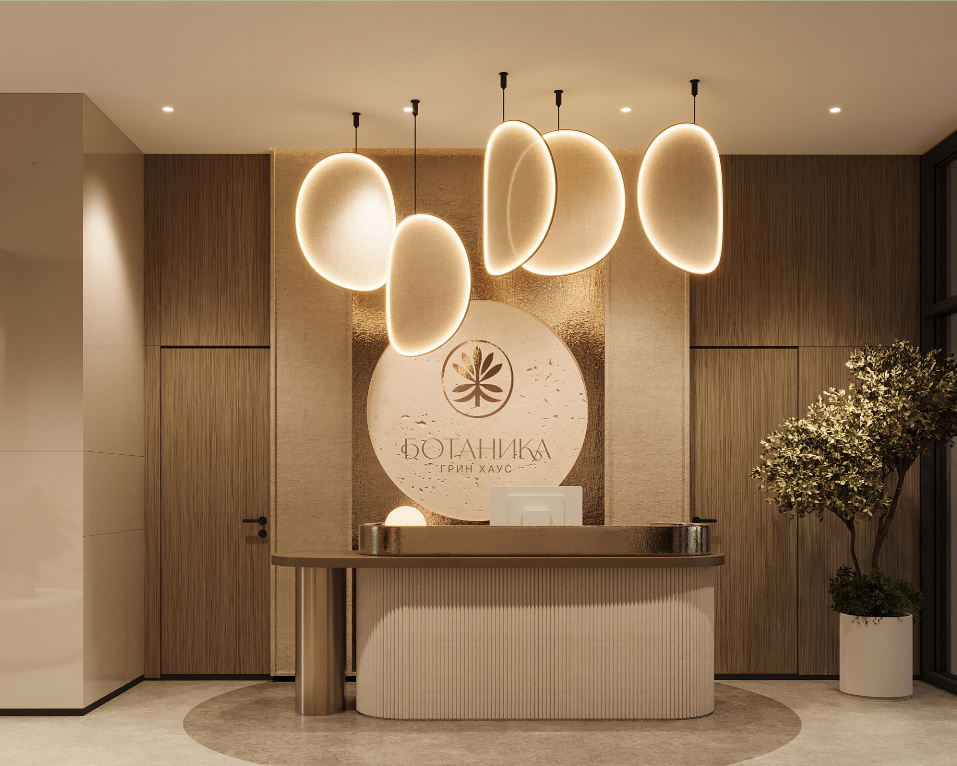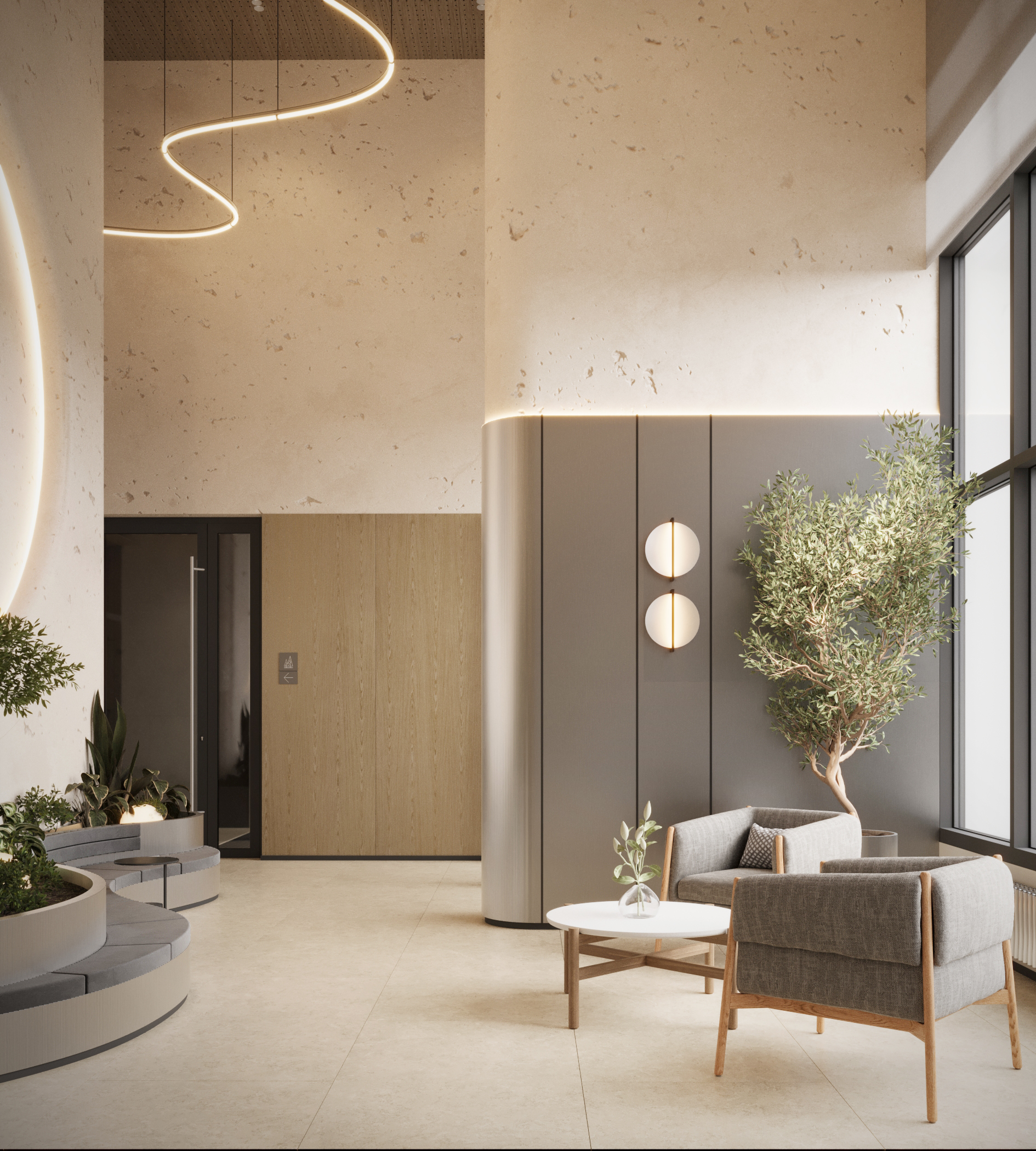 Стильное лобби на первом этаже. Вертикальное озеленение, природные оттенки, обилие солнечного света создают умиротворяющую обстановку